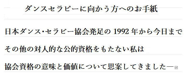 ダンスセラピーでご自身の成長や周りの方への支援を考えている方に ご一読頂ければ幸いです 私のとっての「ダンスセラピー」です〜 「ダンスセラピーに向かう方へのお手紙」(PDF) |